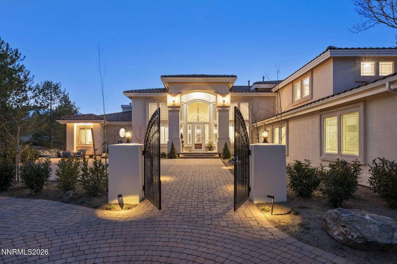 Set on nearly an acre in one of South Reno's most desirable areas, this elegant 5,199-square-foot home offers grand living spaces, stunning Mount Rose mountain views, and a thoughtfully designed floor plan ideal for both everyday living and entertaining. A dramatic marble tile entry welcomes you into the home, where soaring ceilings and expansive windows frame beautiful mountain vistas. The main level features a formal living room and formal dining room, perfect for hosting gatherings or special occasions. All of the main living areas are located on the main floor. Two fireplaces add warmth and character, including one in the master suite. Thoughtful upgrades throughout include 23 newly installed windows, new carpeting, upgraded LED lighting, modernized switches and outlets, and custom shades. Expansive windows throughout the home flood the interior with natural light while framing stunning views of the surrounding mountains. The updated kitchen is designed for the serious home chef, featuring professional-style appliances, a generous workspace, and a layout that flows seamlessly into the home's main living areas. The kitchen features a new KitchenAid Commercial Refrigerator, dishwasher, and a warming/slow-cooker drawer with a new microwave oven and a pressional Viking gas stove with warming shelf and two ovens. The island features granite, a wine fridge, and lower wrap-around cabinets, great for storing large kitchen essentials. The spacious main-level primary suite is a true retreat, complete with a cozy fireplace, spa-like bathroom featuring a sunken soaking tub, a stone walk-in shower, two vanites and two walk-in closets. Three bedrooms are conveniently located on the main level, including the primary suite and two additional bedrooms connected by a Jack-and-Jill style bathroom, offering both privacy and functionality. Three bathrooms have been completely renovated. Upstairs, a large game room loft provides incredible flexibility and can easily serve as a second living area, media room, or entertainment space. and features access to a large private deck with stunning valley views. An oversized upstairs bedroom with an attached bathroom creates the perfect option for a second primary suite, guest retreat, or private quarters. Additional highlights include a spacious four-car garage and a beautifully sized 0.97-acre lot that offers privacy and room to enjoy the surrounding natural beauty. The grounds have been thoughtfully redesigned with all-new landscaping, a newly installed drip irrigation system throughout the property, mature trees and plantings, expansive paver patios and walkways, two pergolas, a partial in-ground custom spa with a stone trim, and a welcoming front courtyard with pillars and gated entry. The side yard features fruit trees, vibrant flowers, and a charming garden walkway, while the generous lot still offers plenty of space to add a pool, lawn, or create your own private retreat. With its generous floor plan, mountain views, and prime South Reno location just minutes from outdoor recreation, shopping, and dining, this exceptional home offers the perfect blend of luxury, comfort, and lifestyle.